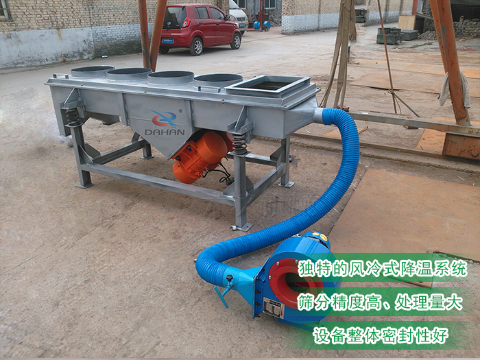 風冷式直線振動篩在進料口底部或箱體下側(cè)端增加了風機降溫冷卻系統(tǒng),在進料口加裝篩網(wǎng)及小型排料口使大顆粒結(jié)塊物料從小型排料口中排出,該裝置可有效攔截大顆粒并緩沖物料對篩網(wǎng)的沖擊,延長篩網(wǎng)使用壽命,在物料在進入設(shè)備時,位于進料口底部或箱體下側(cè)端的風機降溫冷卻系統(tǒng)對其進行降溫作業(yè),在激振力和物料自重力的合理作用下,降溫后的物料在篩面上被拋起、跳躍式向前做直線運動,通過多層篩網(wǎng)過濾不同規(guī)格的篩上物及篩下物,分別從各層的出料口排出,達到篩選和分級的目的。