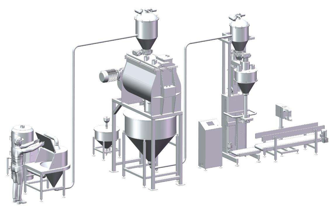 當(dāng)小袋物料需要拆包倒入下道工序時,只需人工直接拆包放入系統(tǒng)即可。給料過程中產(chǎn)生的物料粉塵由除塵風(fēng)機(jī)收集。物料通過振動篩(安全篩)攔截散狀物料和異物,保證符合要求的顆粒順利輸入。