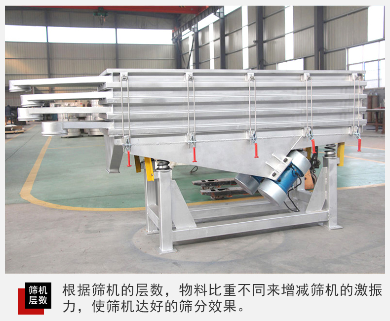 2,直線篩振動(dòng)篩篩分面積廣,該設(shè)備從粉狀篩分到顆粒狀物料篩分都能完成同時(shí)還能夠篩分多種物料等級。
