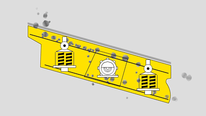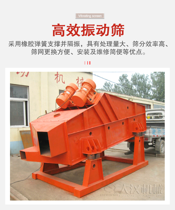 高效振動(dòng)篩是利用振動(dòng)電機(jī)或普通電機(jī)激振器做為振動(dòng)源,使篩體沿激振力方向作周期性往復(fù)振動(dòng),物料在篩面上沿直線方向作拋物線運(yùn)動(dòng),從而達(dá)到篩分目的。